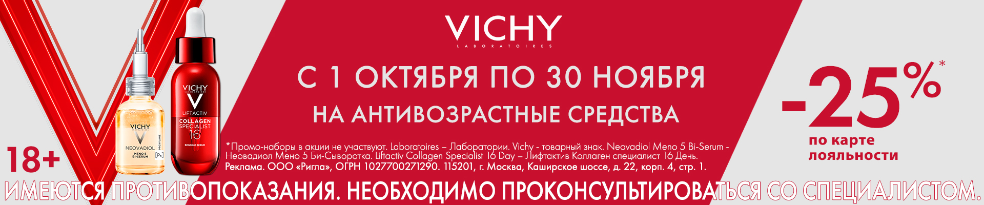 Скидка 25% на антивозрастные средства бренда Виши по карте лояльности.